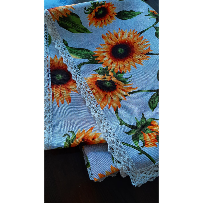 Десен СЛЪНЧОГЛЕДИ - цветна покривка във винтидж стил, която ще създаде настроение във всеки дом. Основни цветове - оранж и зелен на светъл фон.